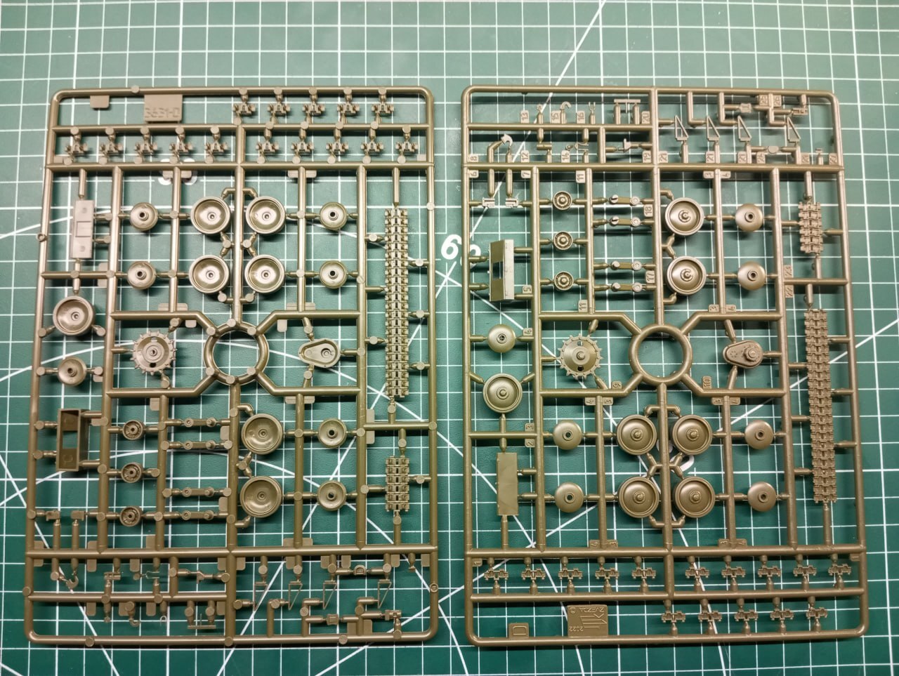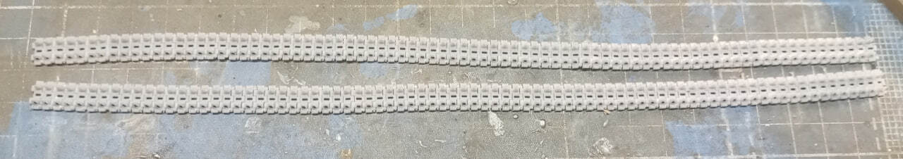 Уже в самом конце, устанавливая гусеницы, я сломал одну их них в нескольких местах. Как я уже писал, траки надеваются на звездочку с очень большим трудом, поэтому, когда я надавил посильнее, лента просто хрустнула и развалилась по шарнирам. К счастью, мне удалось ее и надеть на звездочку, и склеить так, что места разрывов оказались практически незаметны. Заодно я выкинул из этой ленты один лишний трак, из-за которого провис получался совсем уж чудовищным (не то чтобы он перестал быть чудовищным, но лишний трак в ленте определенно делал картину еще хуже)