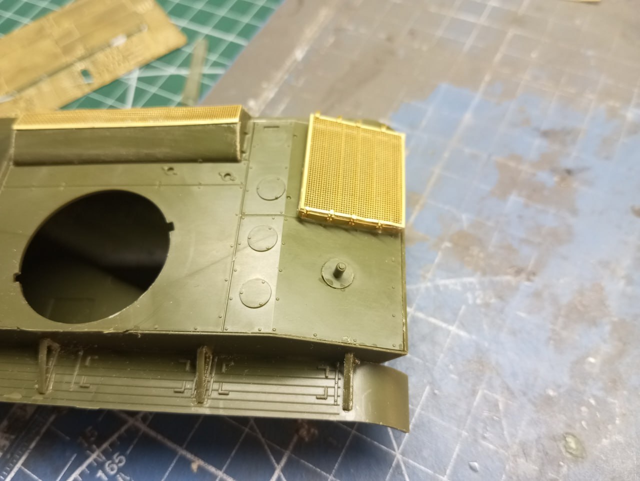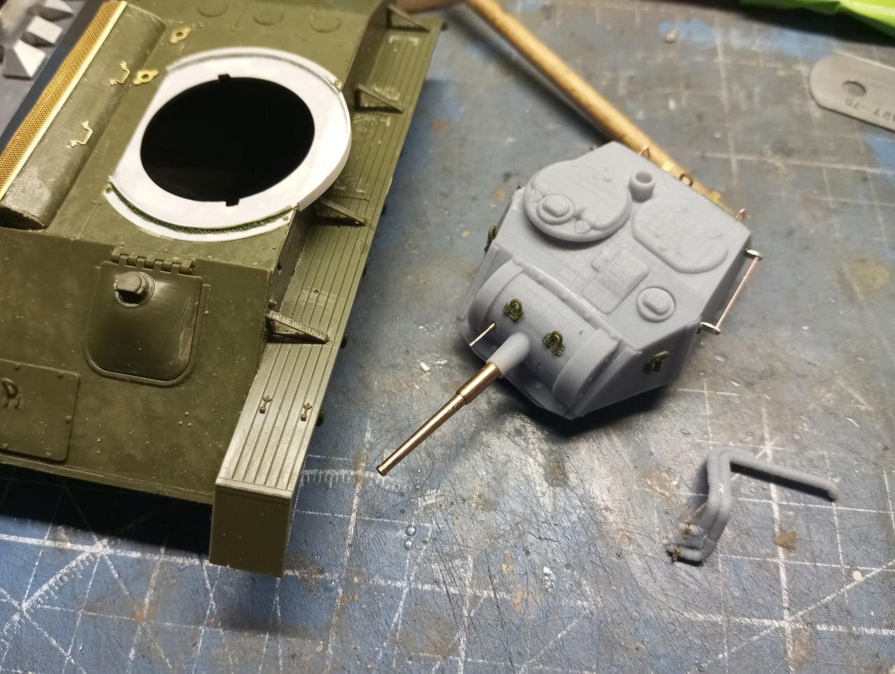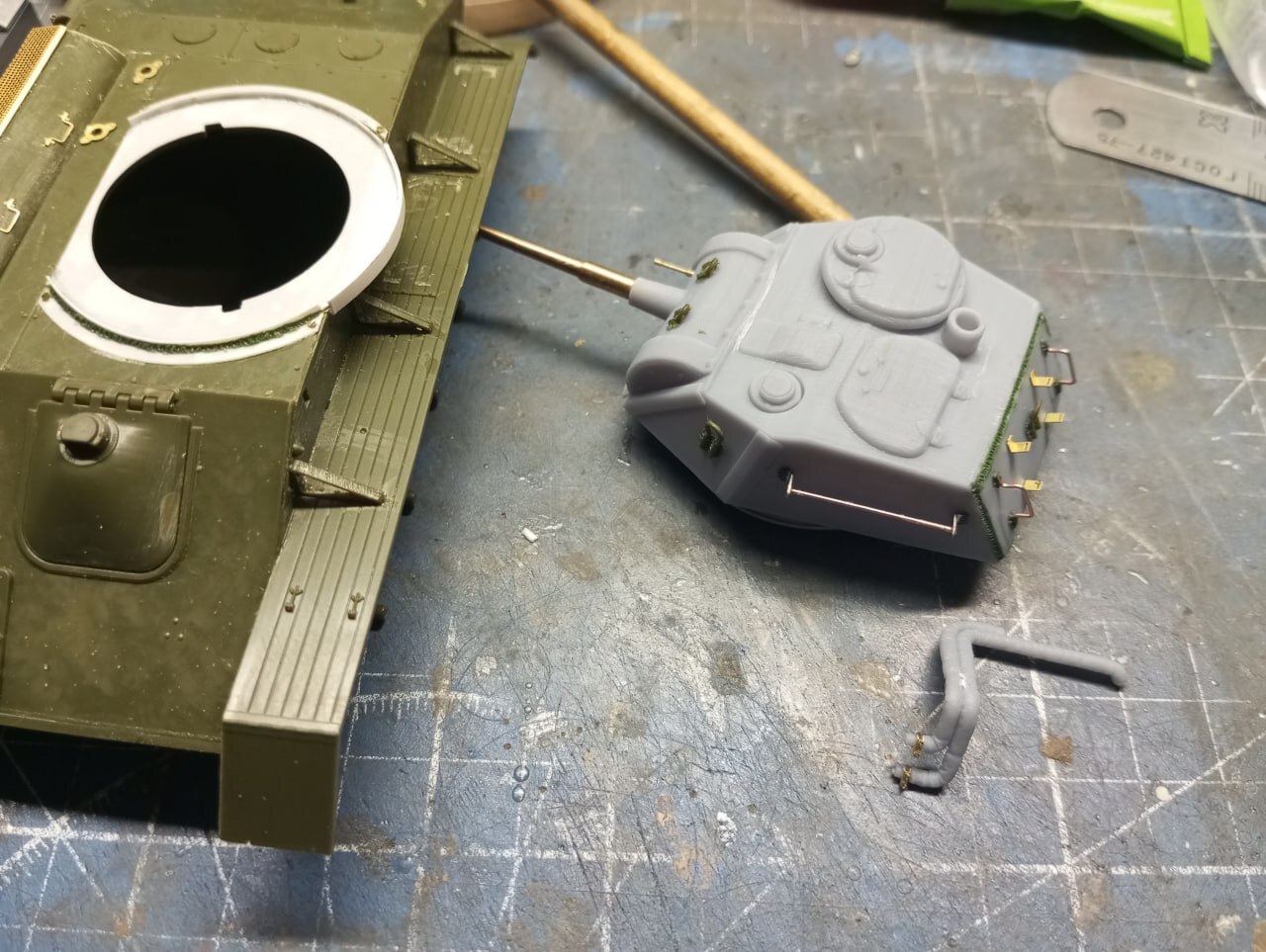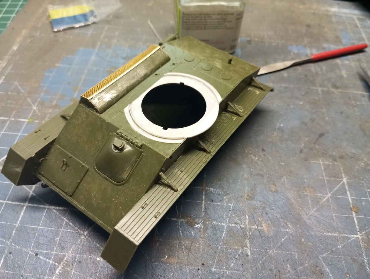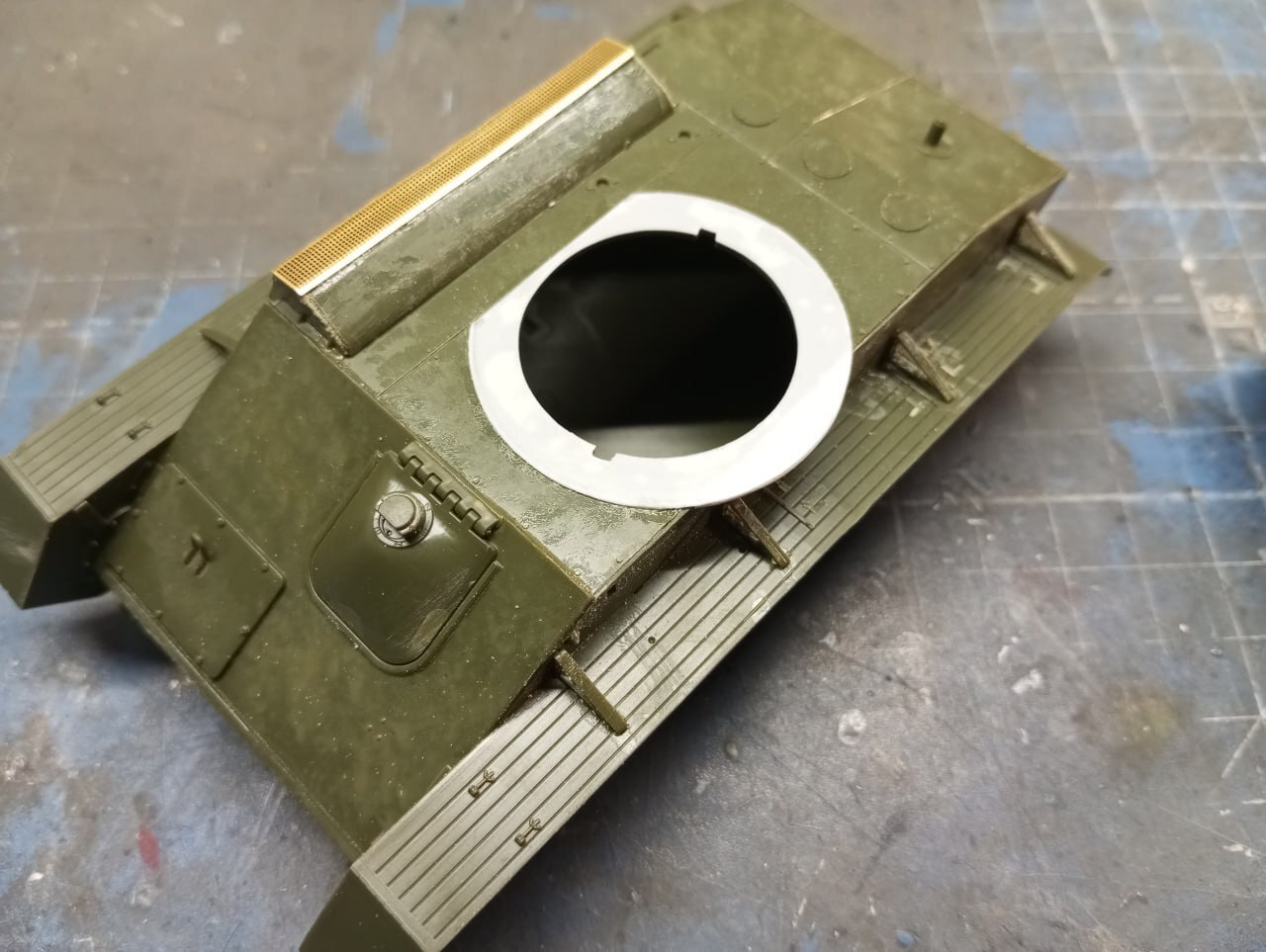 Вот здесь башенный погон уже практически завершен. Видно, что со стороны правого борта пластиковое кольцо срезано по линии шва, пролегающего по крыше корпуса.
