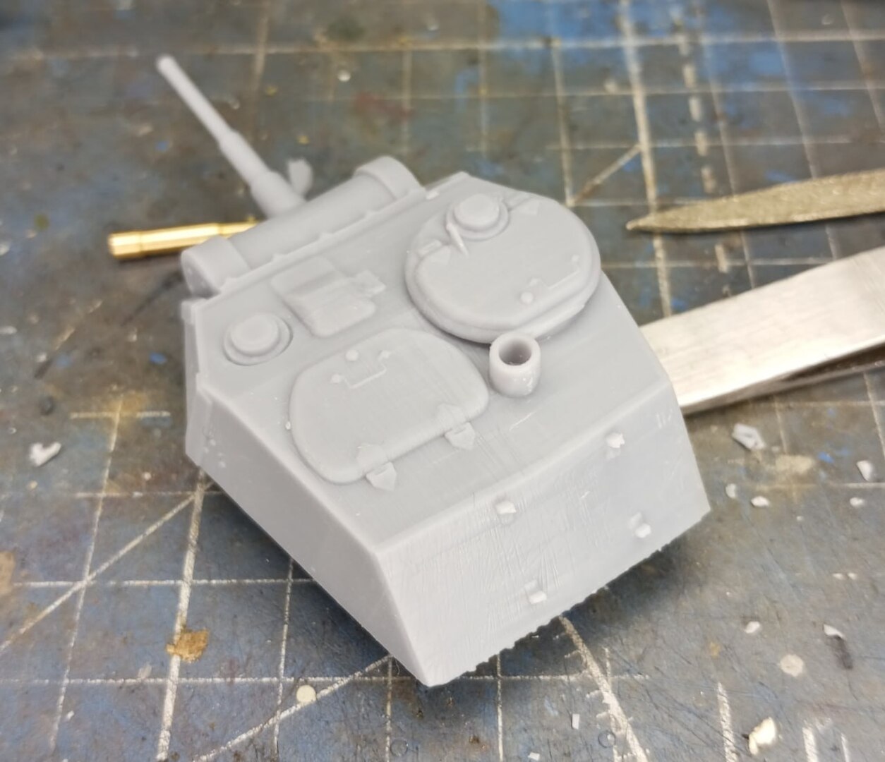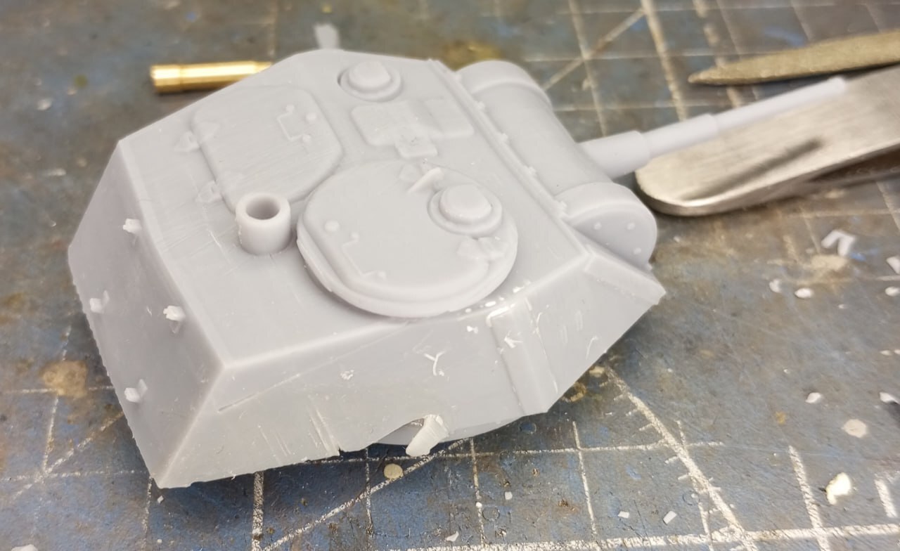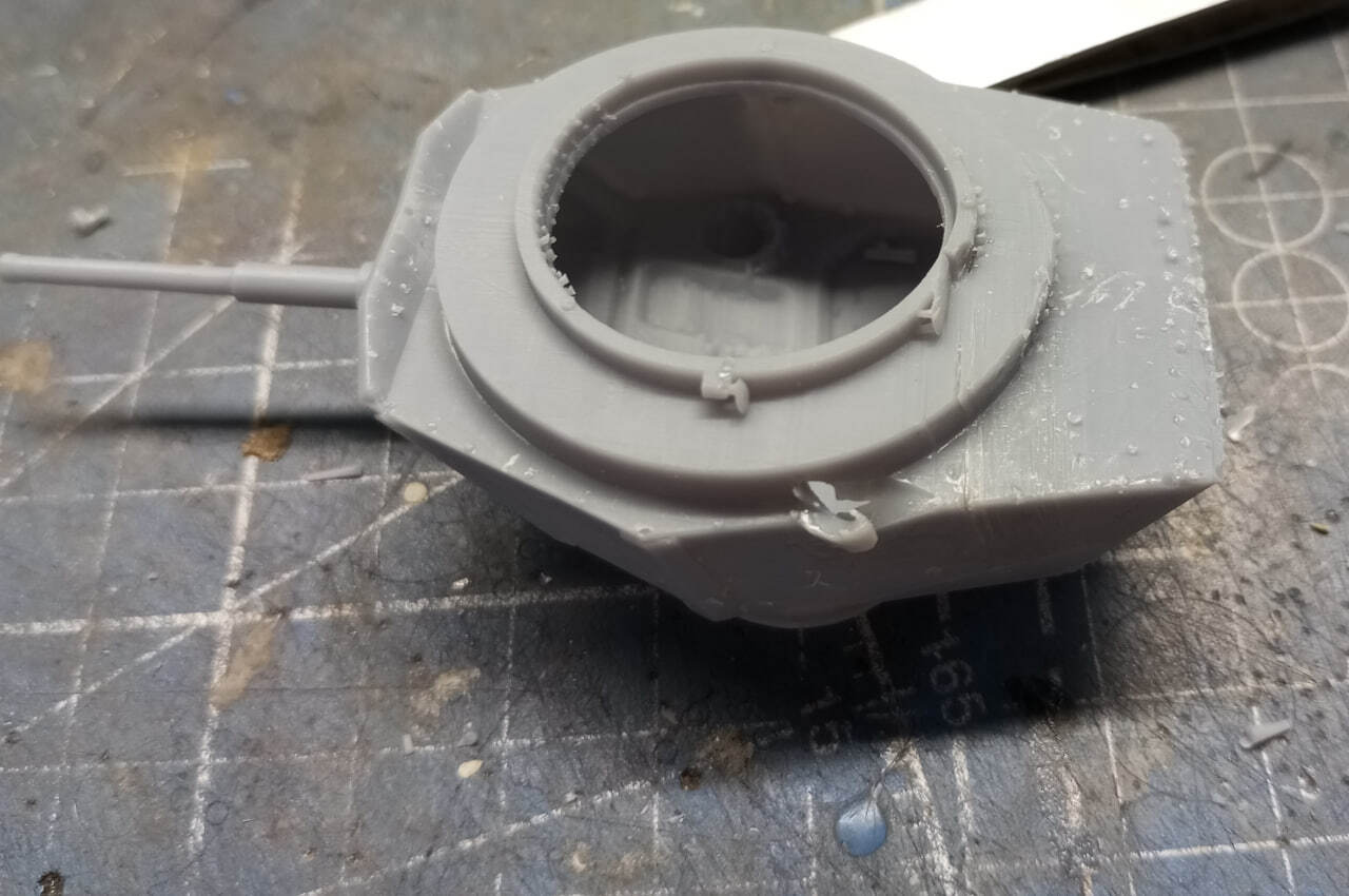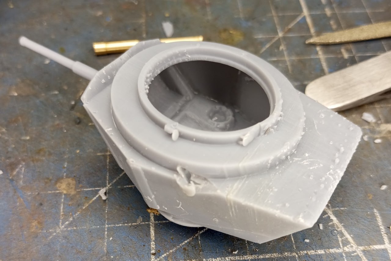 Потому что качество этой башни, которая, конечно и напечатана на 3D-принтере, такое, что тут наверное даже не 4D, а все пять. Какие-то царапины, кривоватые стенки, общая замыленность детализации, заметные слои, а главное — кем-то выгрызенный кусок из правого борта. Вот с таким исходником мы и будем работать. К ней в комплекте шел небольшой довесок в виде прилива на корпус, поручней и ствола пулемета, но, каким-то неведомым образом я этот "литник" потерял, и поэтому все недостающее пришлось делать самому или пристраивать детали, оставшиеся от неиспользованной башни от семидесятки.