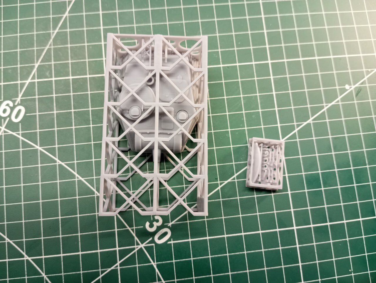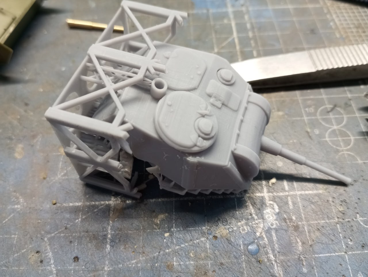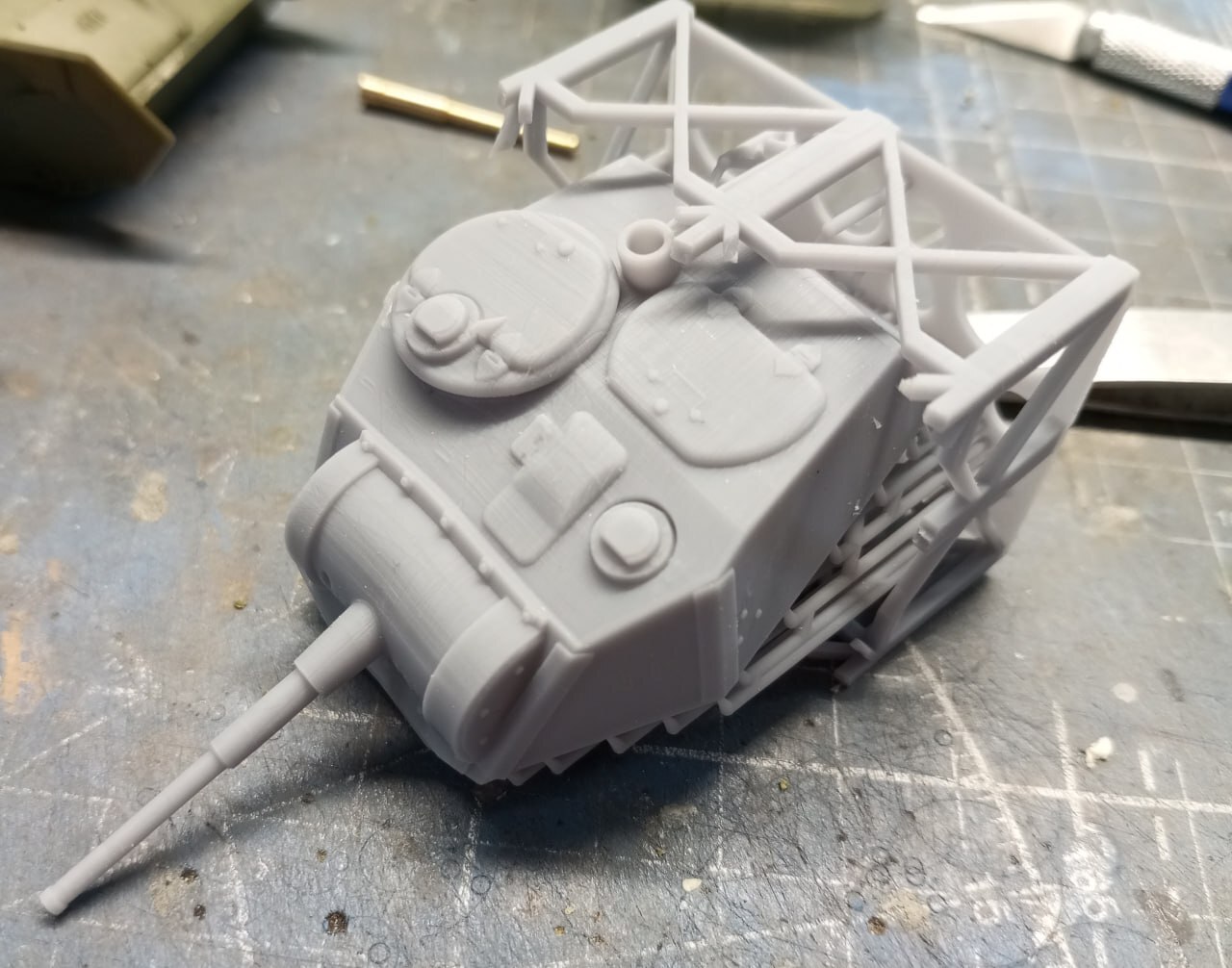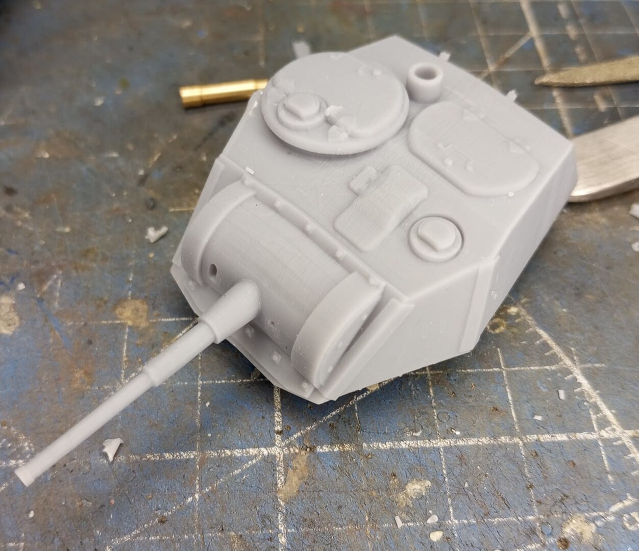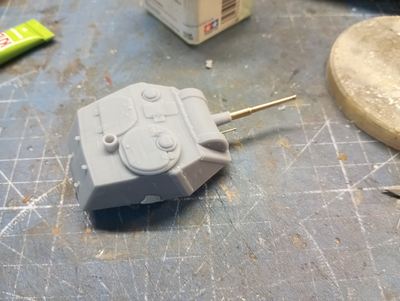 Потому что качество этой башни, которая, конечно и напечатана на 3D-принтере, такое, что тут наверное даже не 4D, а все пять. Какие-то царапины, кривоватые стенки, общая замыленность детализации, заметные слои, а главное — кем-то выгрызенный кусок из правого борта. Вот с таким исходником мы и будем работать. К ней в комплекте шел небольшой довесок в виде прилива на корпус, поручней и ствола пулемета, но, каким-то неведомым образом я этот "литник" потерял, и поэтому все недостающее пришлось делать самому или пристраивать детали, оставшиеся от неиспользованной башни от семидесятки.