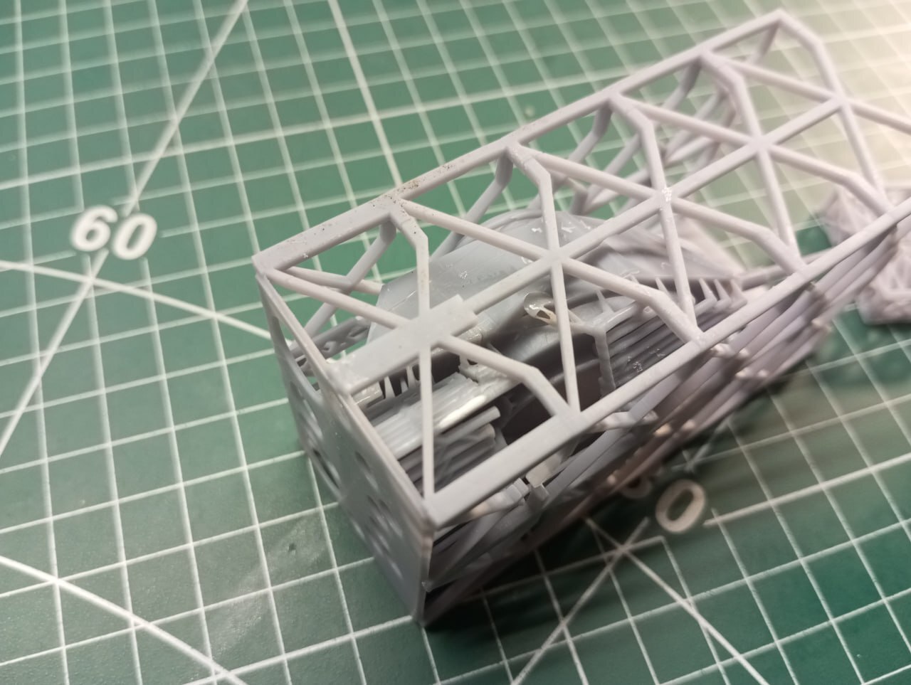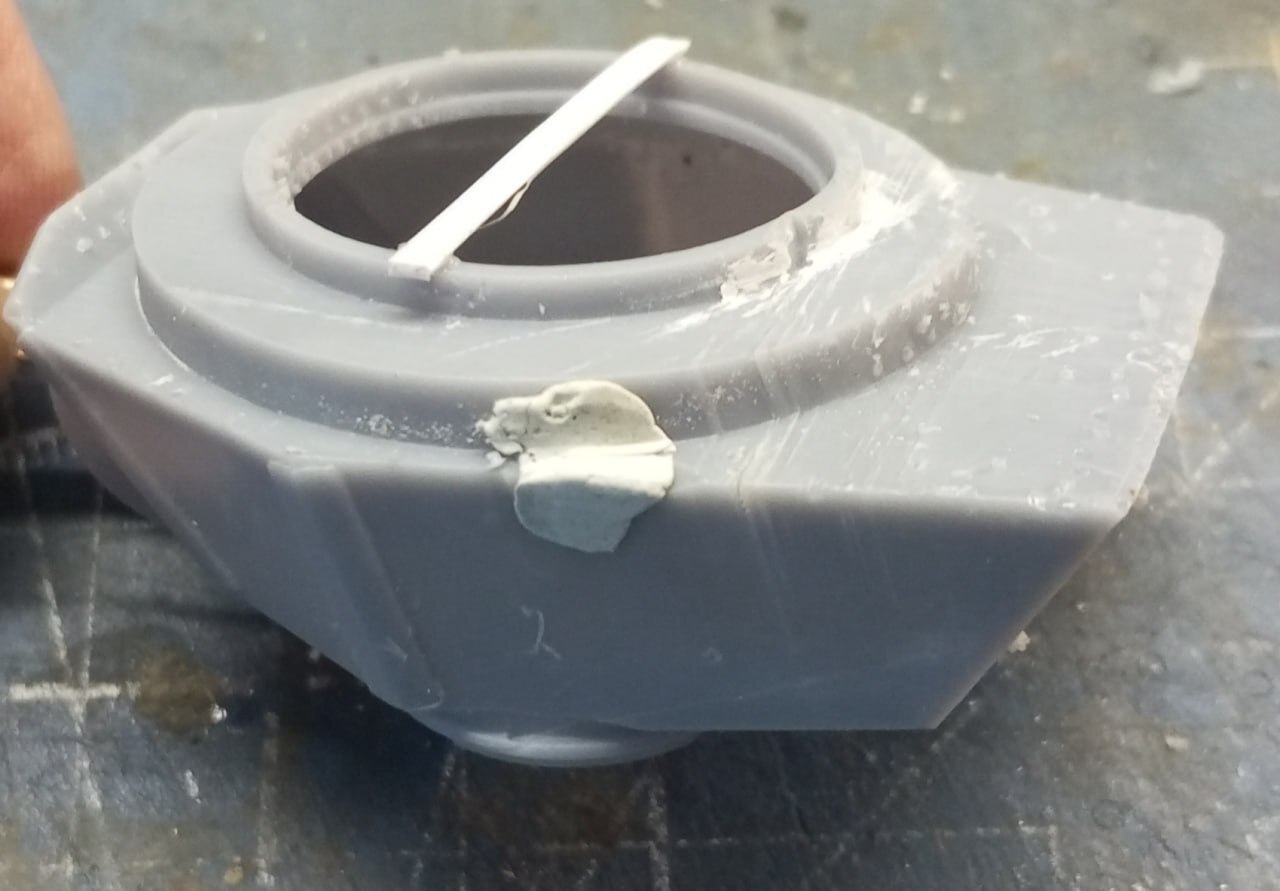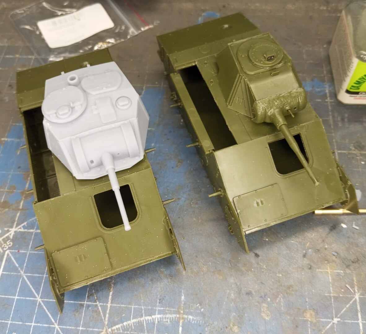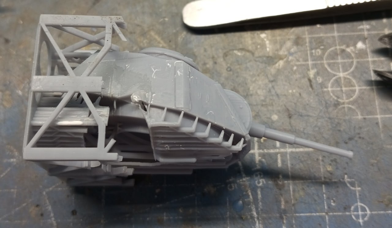 Потому что качество этой башни, которая, конечно и напечатана на 3D-принтере, такое, что тут наверное даже не 4D, а все пять. Какие-то царапины, кривоватые стенки, общая замыленность детализации, заметные слои, а главное — кем-то выгрызенный кусок из правого борта. Вот с таким исходником мы и будем работать. К ней в комплекте шел небольшой довесок в виде прилива на корпус, поручней и ствола пулемета, но, каким-то неведомым образом я этот "литник" потерял, и поэтому все недостающее пришлось делать самому или пристраивать детали, оставшиеся от неиспользованной башни от семидесятки.