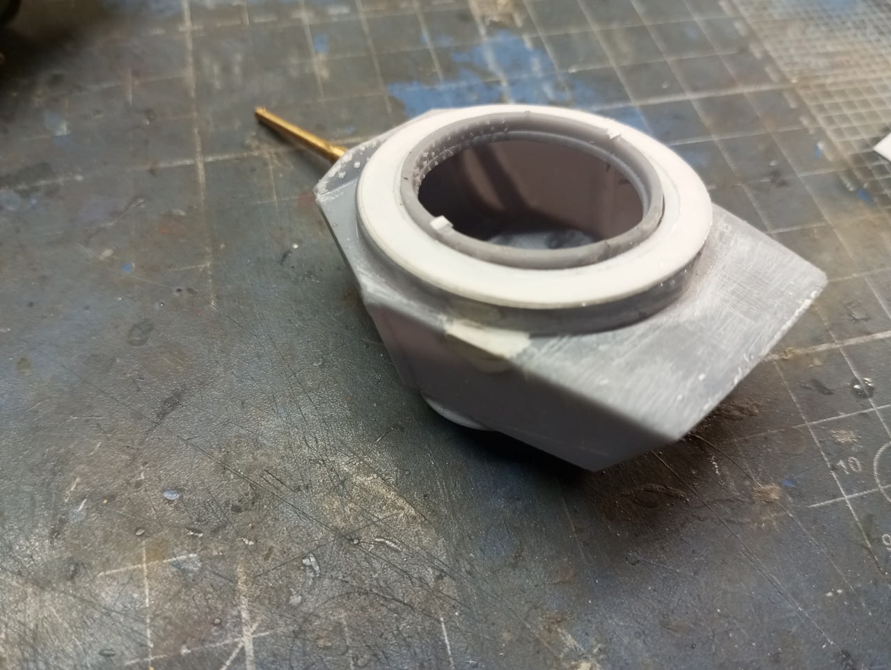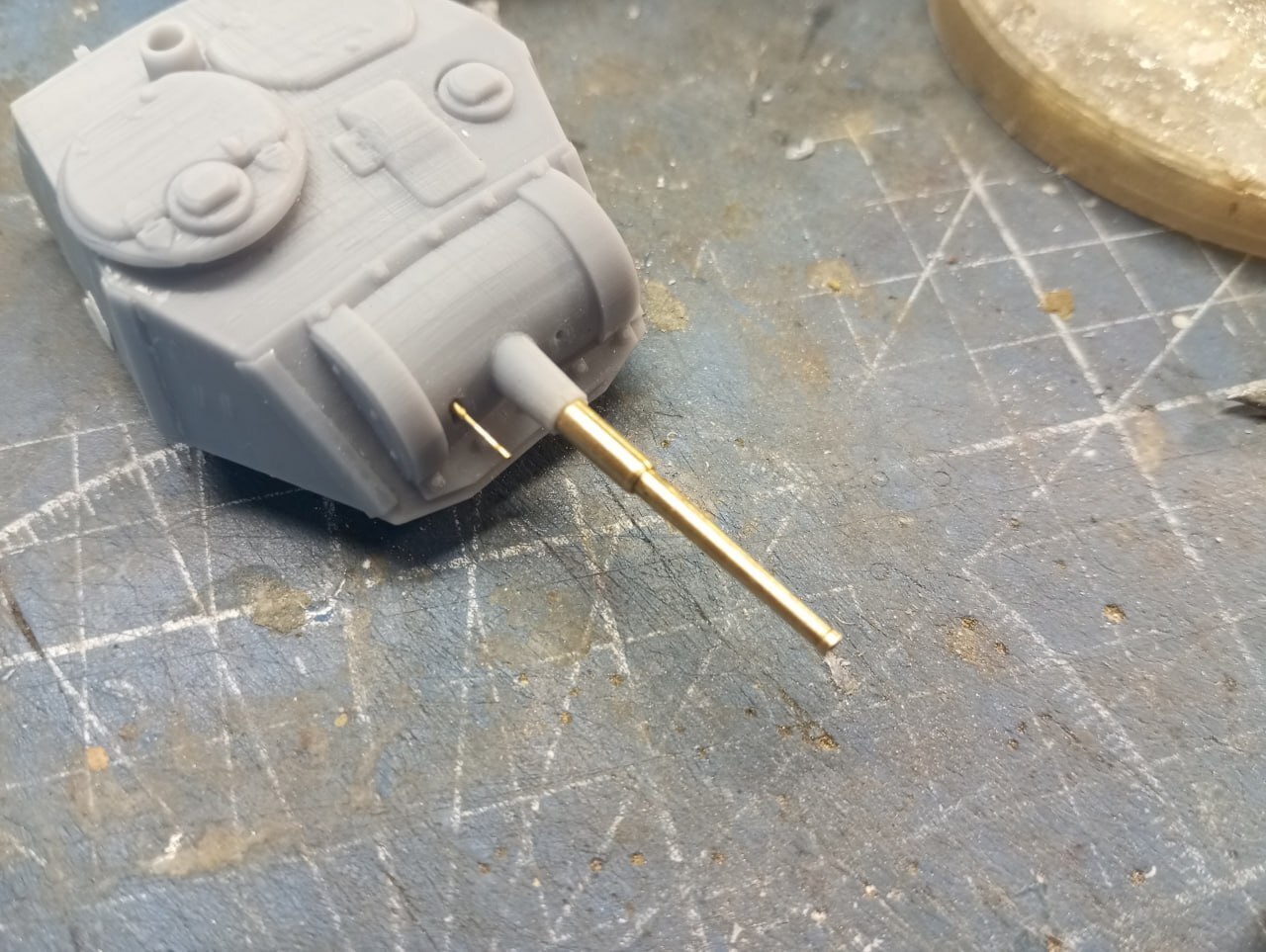 Как я писал выше, несмотря на то, что ствол отпечатан неплохо, я решил заменить его на точеный. Не столько из практических целей, сколько из желания хоть куда-нибудь этот ствол пристроить. Для его установки, я очень аккуратно рассверлил бронировку на орудийной маске, изо всех сил стараясь не сколоть смолу, которая тут еще более хрупкая, чем она бывает обычно. После хвостовик ствола был обточен, и лишь затем вся конструкция была собрана на суперклей. Также был установлен точеный ствол пулемета. Под него я высверлил небольшую дырочку, чтобы он надежнее держался.