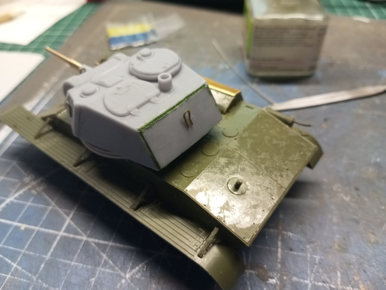 Снова вернемся к башне. Задняя стенка у нее была выгнута дугой. Чтобы исправить это, пришлось башню натурально обтачивать на грубом напильнике, придавая задней стенке положенный плоский вид. После этого, по ее периметру была сделана ступенька, в которой я имитировал сварной шов из зеленки. Также были "обварены" и подъемные рымы, которые я взял от штатной башни из набора (как помним, печатные детали к тому времени я уже потерял, поэтому приходилось искать им замену)