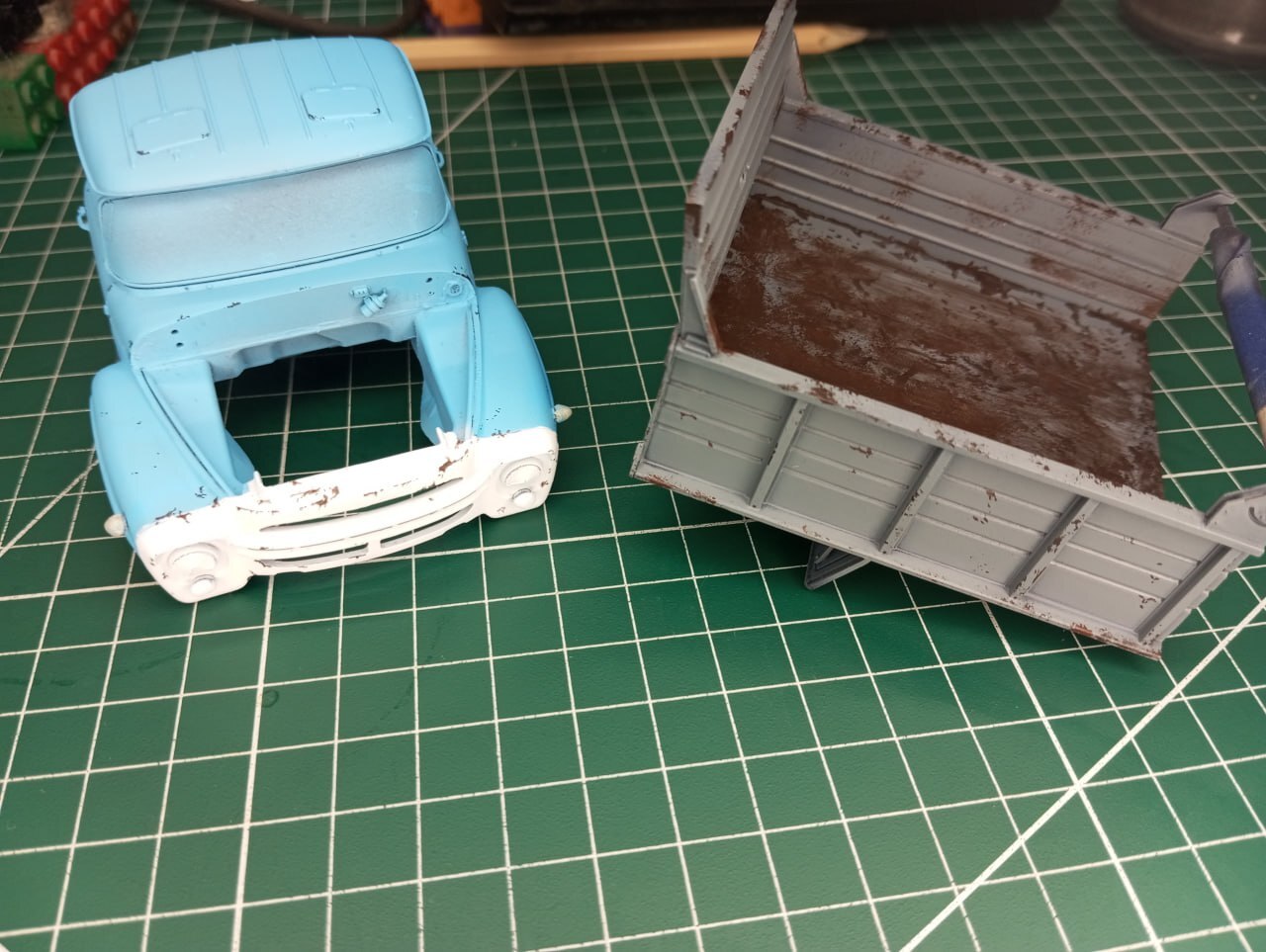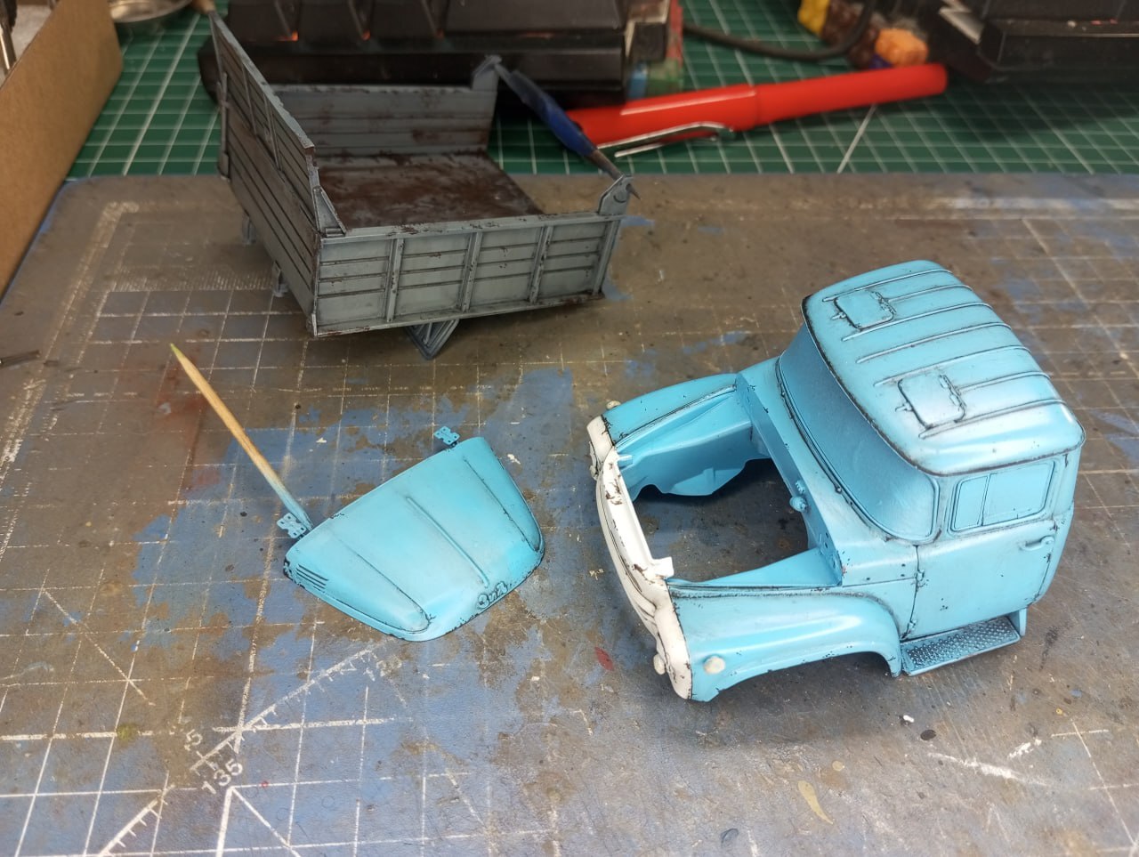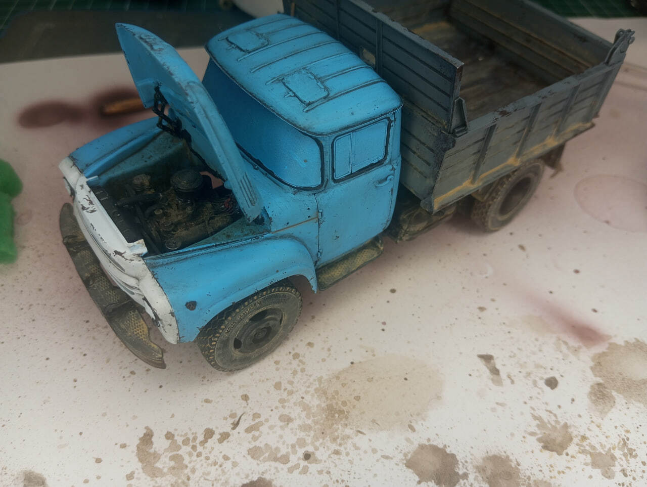 И в принципе, на этом осталось только окончательно завезерить то, что еще не было завезеренно (использовал пигменты, а также масло, для имитации ржавых потеков на кузове и кабине) и приклеить зеркала. Зеркала у меня тоже были 3D-печатныме, и я вынужден констатировать, что вот эта печать — не удалась. Ну или мне брак попался, со смещением печати. В любом случае, зеркала у меня получились, откровенно говоря, кривые, что бросается в глаза на итоговых фотографиях. Увы, поставить штатные тоже не было вариантом, так как эти детальки я нечаянно сломал еще на литнике. Поэтому, к сожалению, пришлось обойтись тем, что есть. Я пытался исправить ситуацию настолько, насколько это было в моих силах. Получилось или нет — решать зрителю.