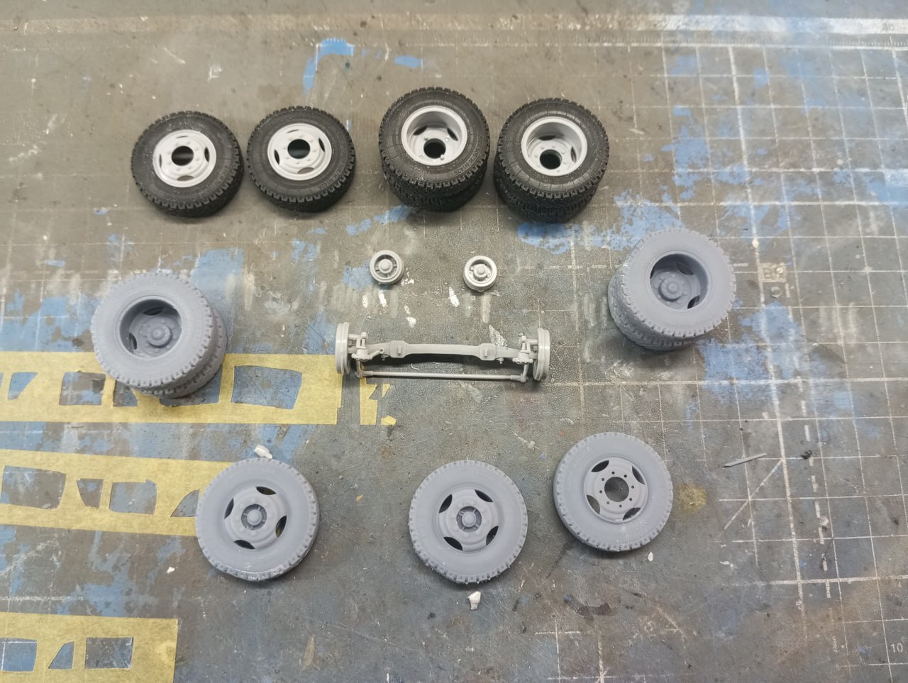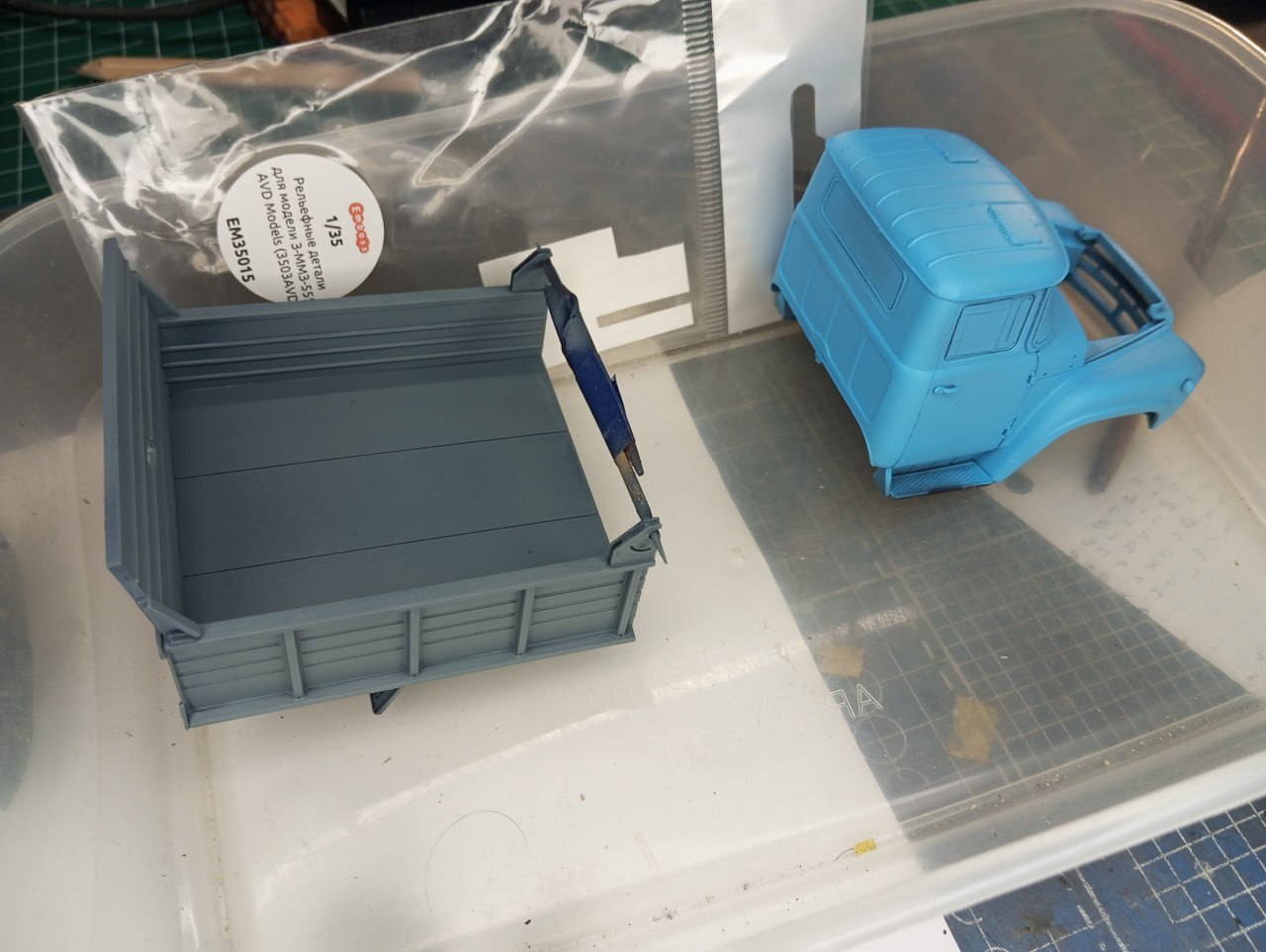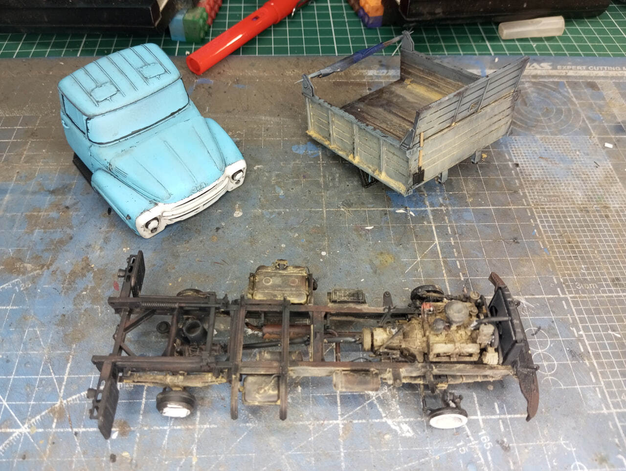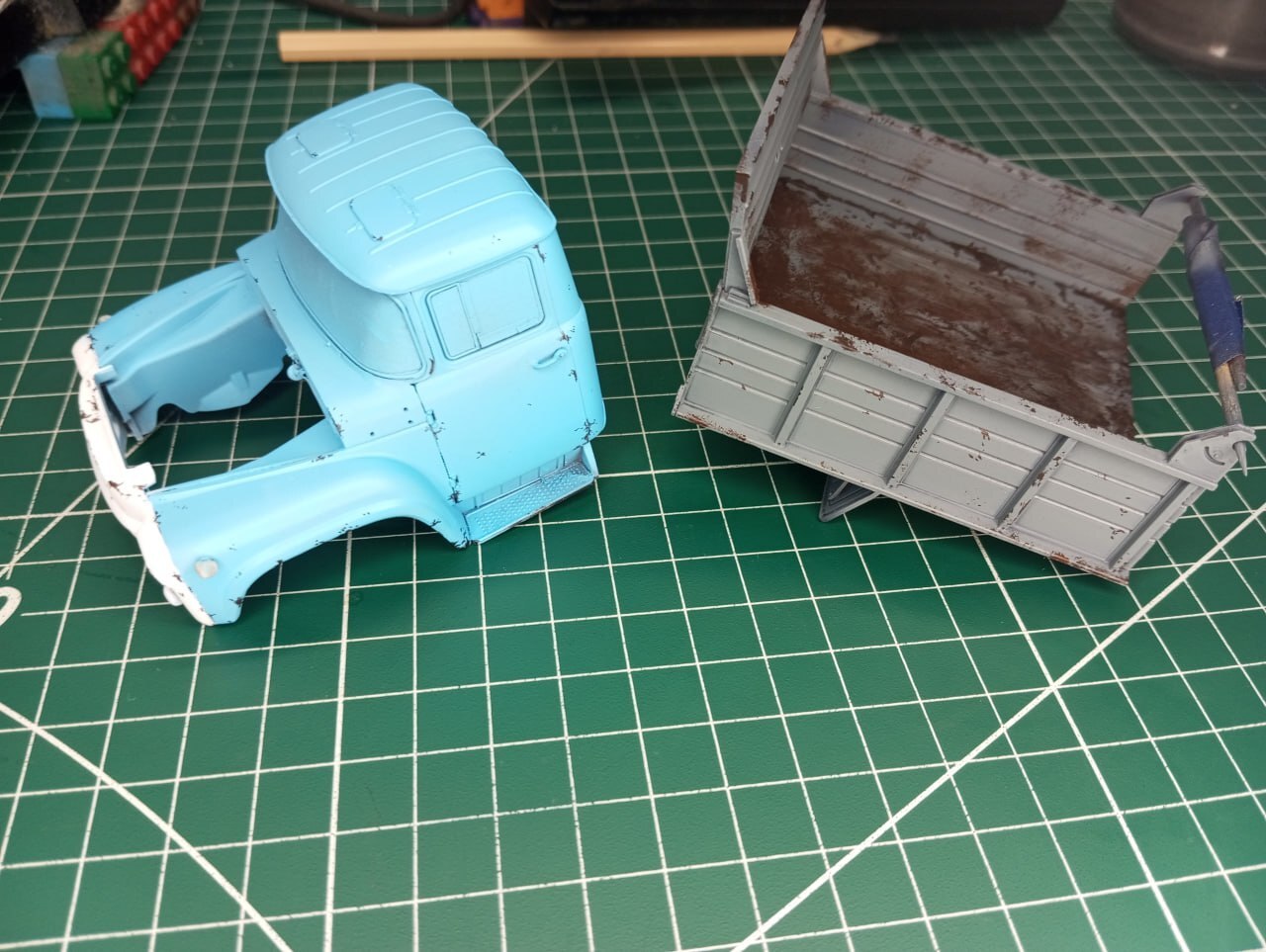 И в принципе, на этом осталось только окончательно завезерить то, что еще не было завезеренно (использовал пигменты, а также масло, для имитации ржавых потеков на кузове и кабине) и приклеить зеркала. Зеркала у меня тоже были 3D-печатныме, и я вынужден констатировать, что вот эта печать — не удалась. Ну или мне брак попался, со смещением печати. В любом случае, зеркала у меня получились, откровенно говоря, кривые, что бросается в глаза на итоговых фотографиях. Увы, поставить штатные тоже не было вариантом, так как эти детальки я нечаянно сломал еще на литнике. Поэтому, к сожалению, пришлось обойтись тем, что есть. Я пытался исправить ситуацию настолько, насколько это было в моих силах. Получилось или нет — решать зрителю.