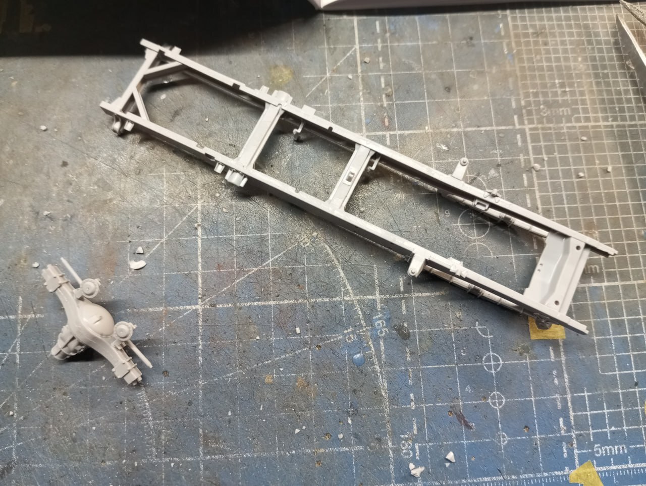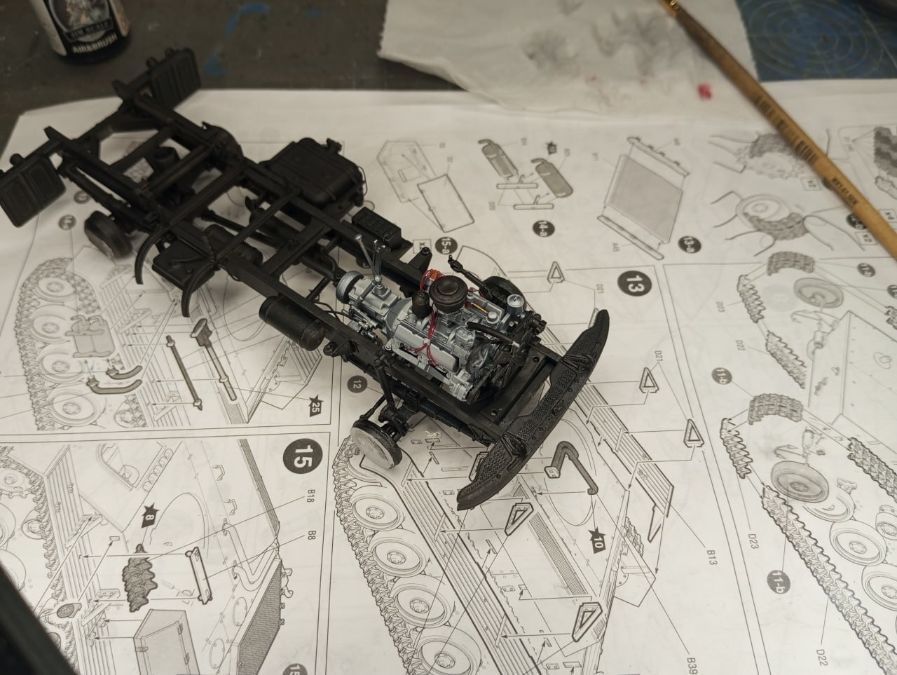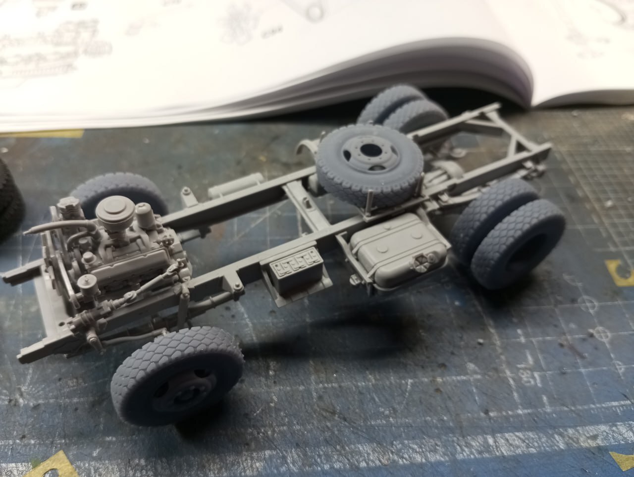 До состояния "на раме" модель собралась быстро и без проблем. Я даже и оглянуться не успел. Да, в паре мест пришлось все же повозиться с толкателями, в паре мест попался облой, однако в остальном сборка простая и приятная.