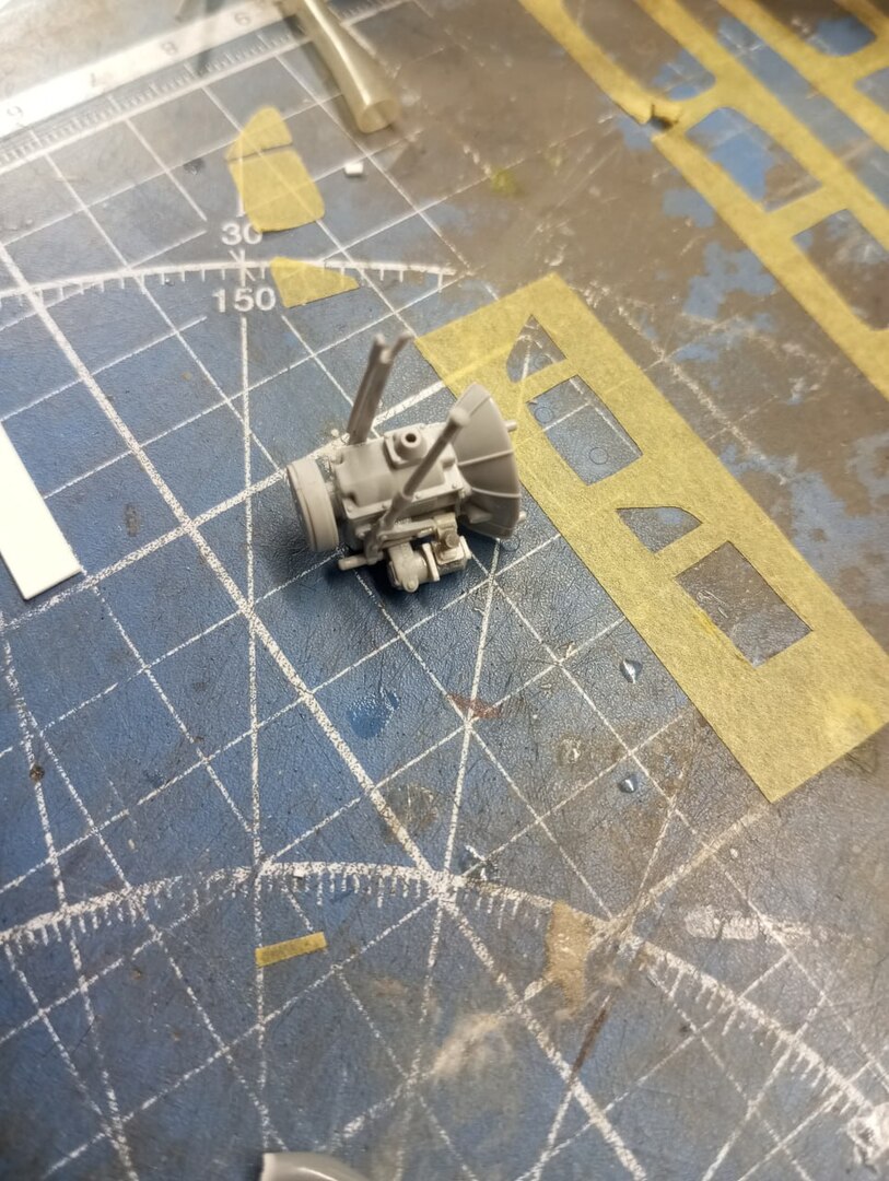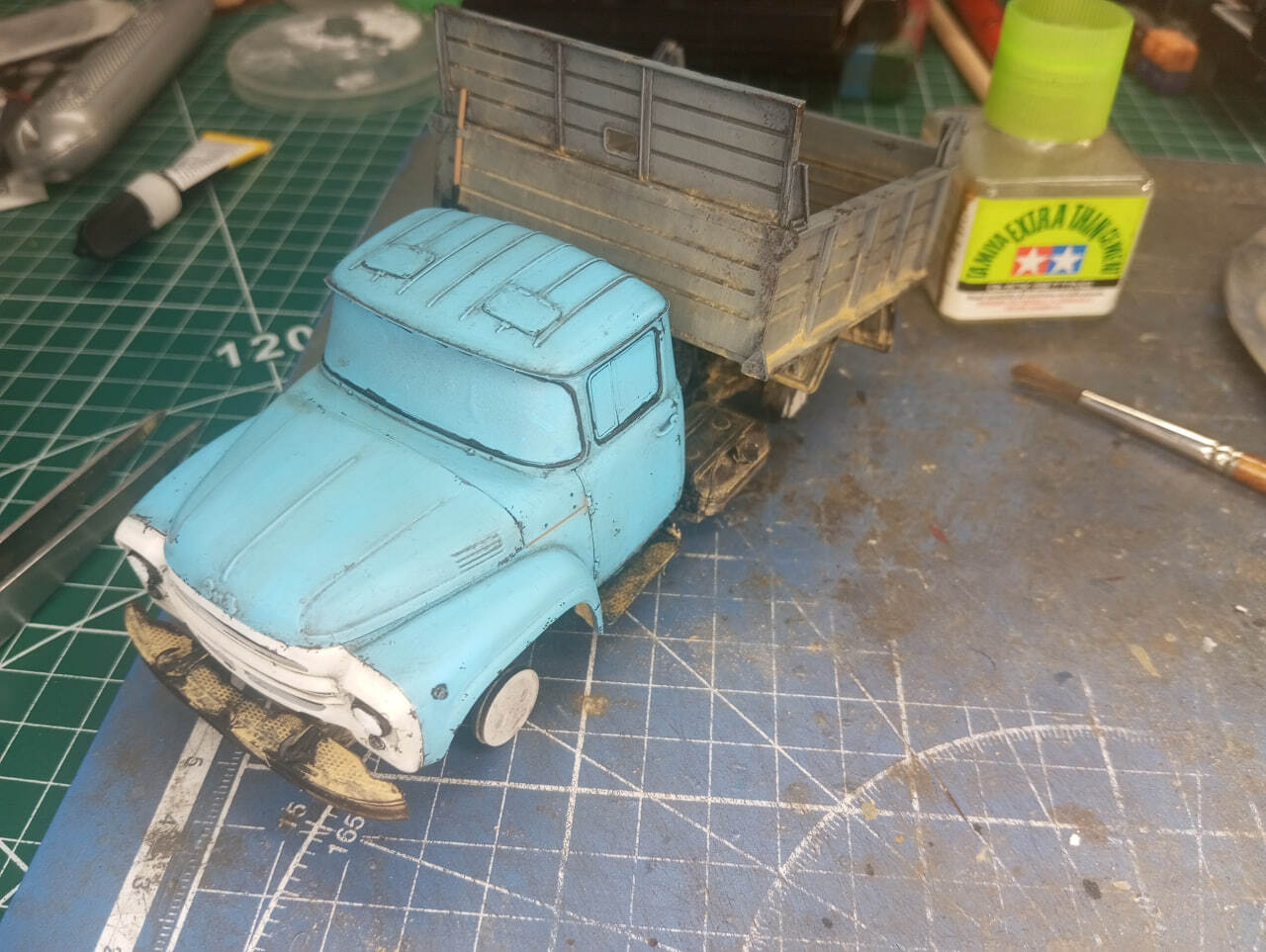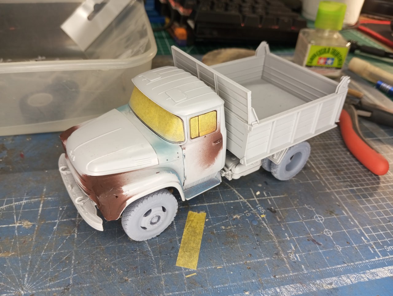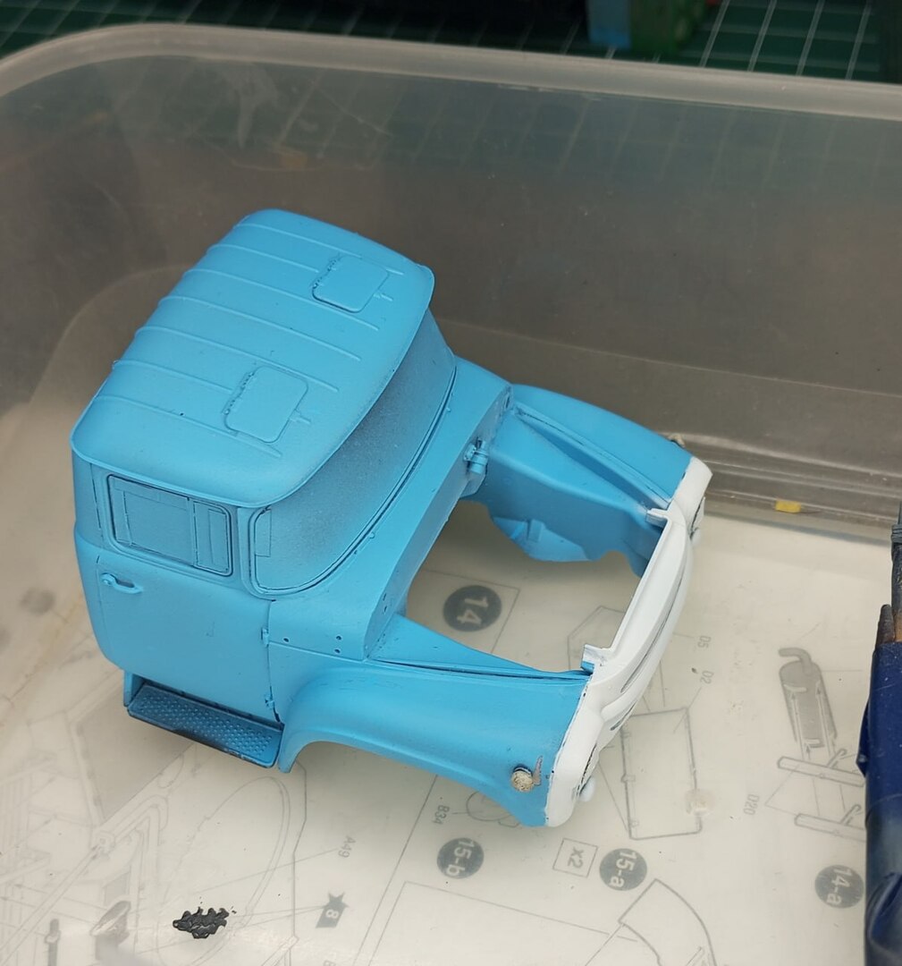 Базовым цветом кабины была все та же "Голубая Адриатика" от Jim Scale. С помощью масок передняя часть кабины была окрашена в белый. Поддувы пришлось устранять отдельно, но это не вызвало проблем. В отличие от недокрасов от замаскированных патафиксом поворотников. Откровенно говоря, сейчас я бы ставил поворотники уже после окраски. Было бы куда меньше возни.