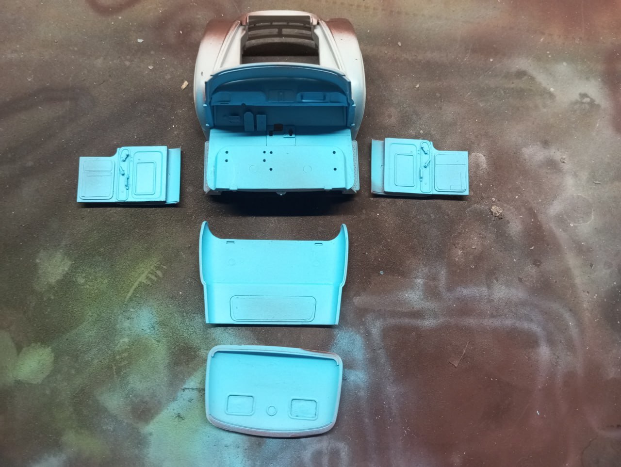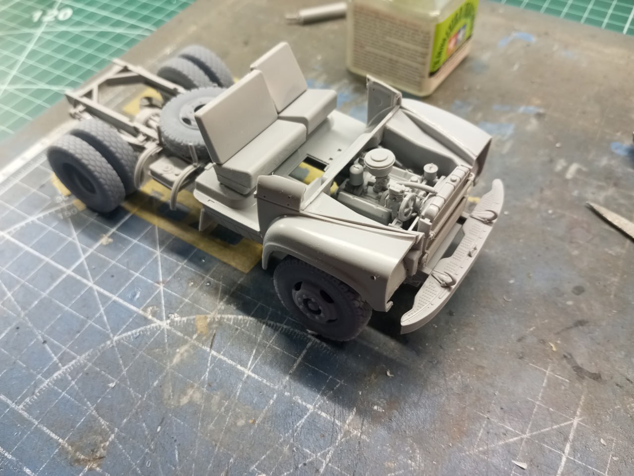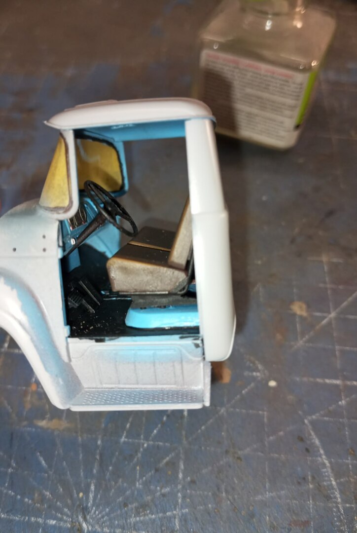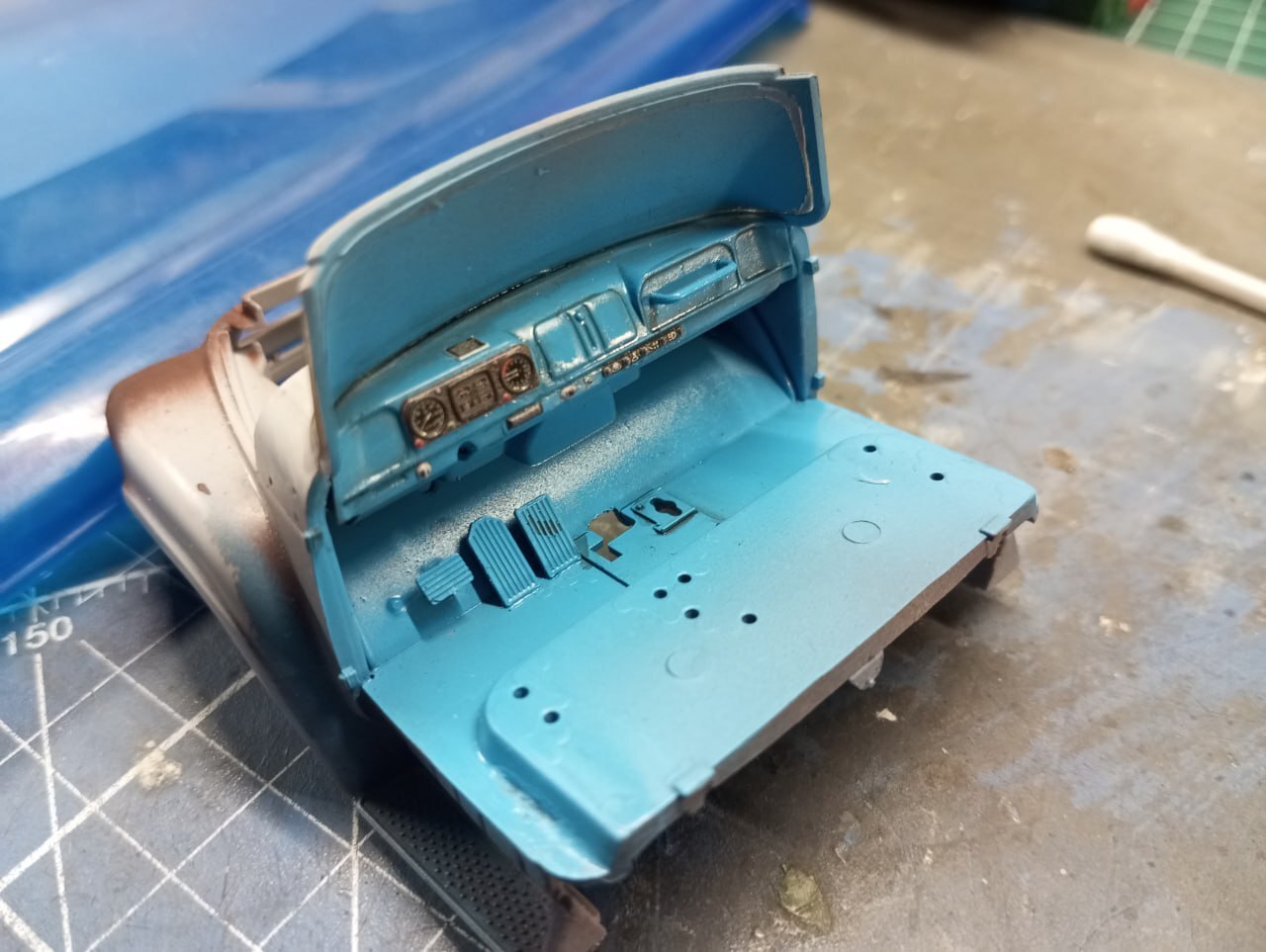 И после грунта, задул кабину изнутри в цвет "Голубая Адриатика" от Jim Scale — они выпускают тематический набор, посвященной данной модели, так что, я бы даже рекомендовал его приобрести (если, конечно, полка не ломится от запасов краски)