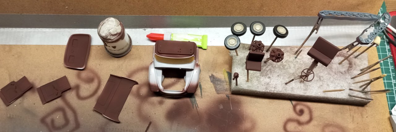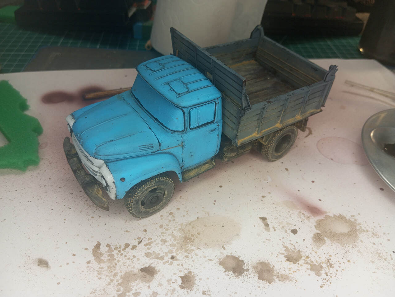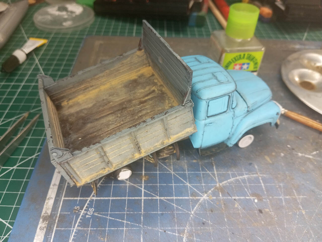 Для везеринга кузова тоже использовал пигменты, но в этот раз замешал их на уайт-спирите, чтобы получилась жидкая кашица. Ее нанес на борта, особенно сконцентрировавшись на нижних внутренних углах конструкции, а после высыхания — смел лишнее кистью. Результат мне понравился — выглядит грязно, но достаточно естетственно.