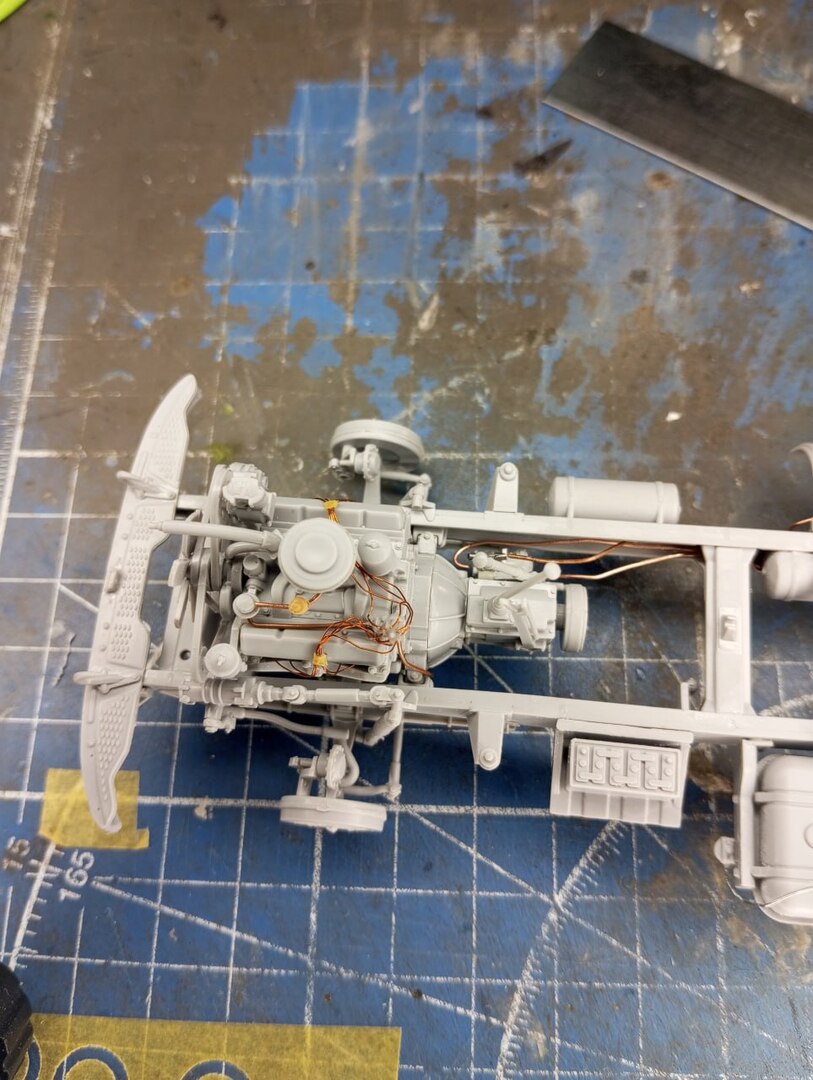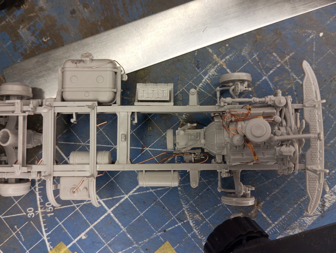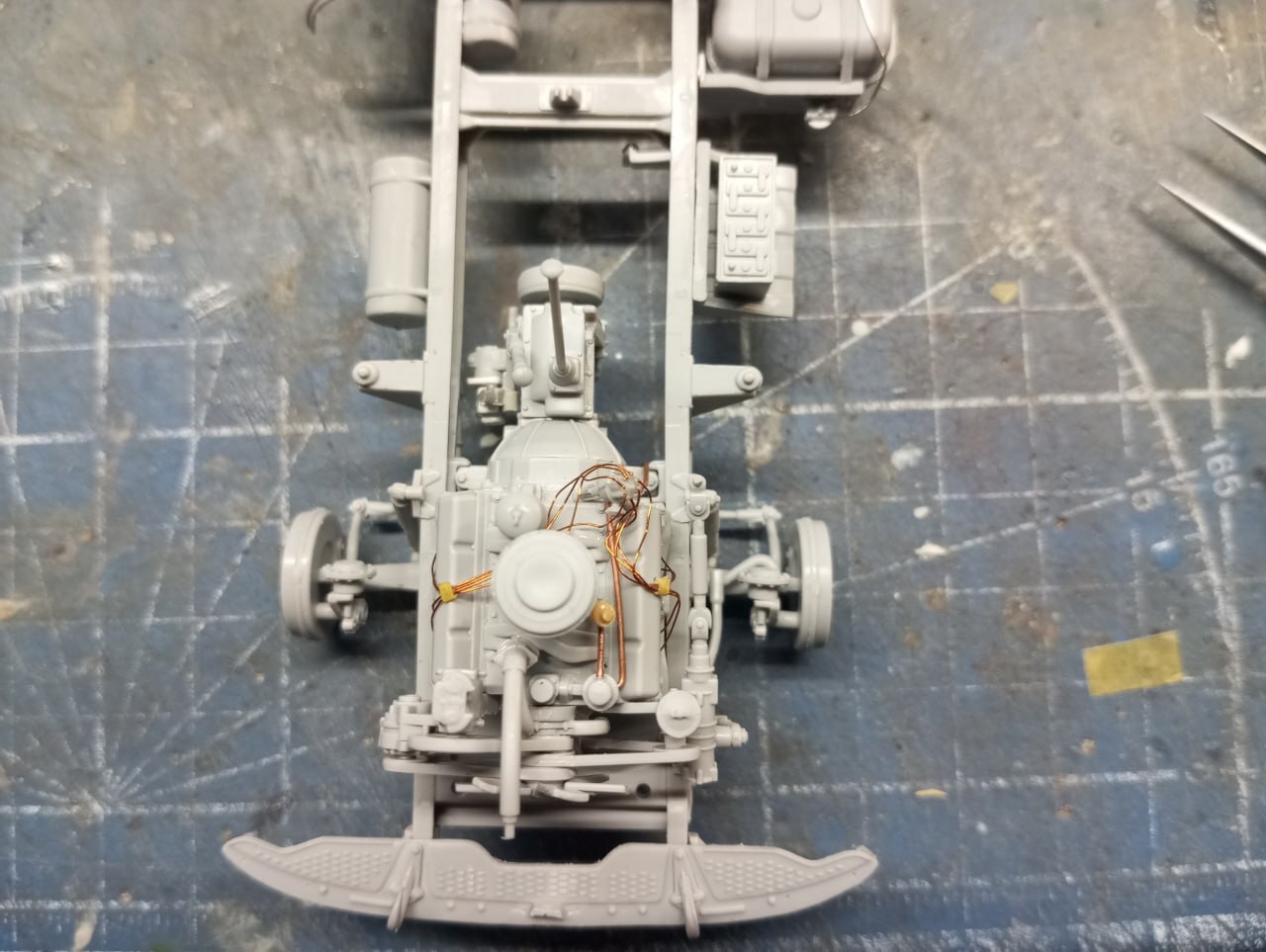 Уже покрасив и собрав подкапотное пространство, я решил добавить туда еще больше деталей — а именно, жгут проводки, идуший по передней стенке кабины. Жгут был сделан из тонких проволочек, которые были собраны воедино втулками, сделанными из тянутой ватной палочки — эти палочки, если их растянуть, как литник, все равно сохраняют внутри пустоту, что позволяет использовать получившиеся трубочки в различных целях.