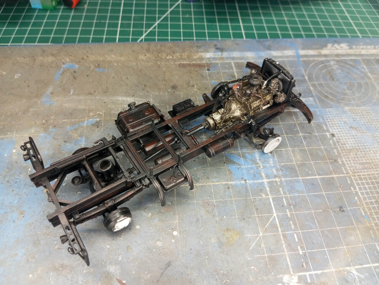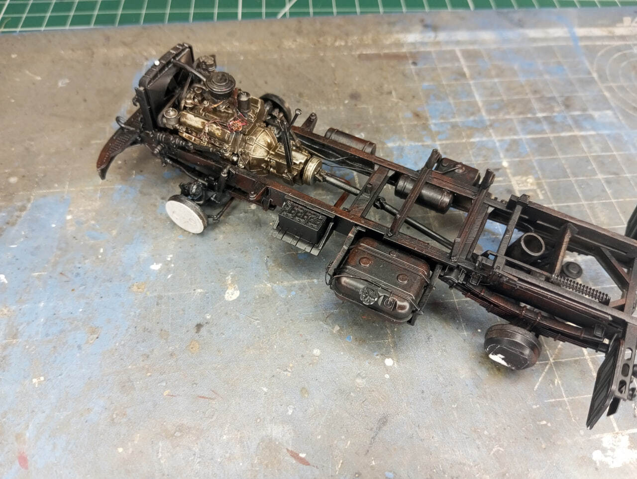 Ну а двигатель подвергся многослойному везерингу с помощью пигментов, жидкостей от AK Interactive и AMMO Mig. Жидкости немного разочаровали. Я ожидал более естественный результат, поэтому, оказалось более правильным решением намешать в них пигментов, чтобы обеспечить более "зернистый" и сухой вид грязевой корки, замешанной на машинном масле.