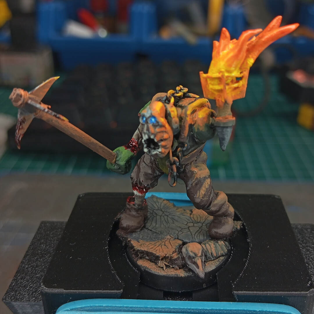 На момент рисования OSL у некро-орка еще не было оружия. Эту кочергу-багор, которая видна на итоговых фотографиях я добавил позже, сделав древко из зубочистки и крючья из полистирола. Окрашена она так же с учетом света факела, ибо одна из самых важных вещей в OSL — это консистентность эффекта.