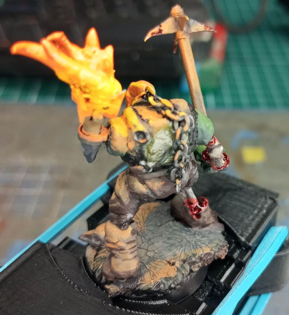 Упомянутый выше факел был добавлен неспроста. Мне очень хотелось потренироваться в рисовании OSL, поэтому я сразу задумал поместить на миниатюру какой-нибудь яркий источник света. Сам по себе основной покрас не представляет чего-либо необычного, а вот изображения освещения от факела потребовало от меня напрячь воображение. Хотя, на деле, сама механика OSL не очень сложная. Чтобы объект казался светящимся, на миниатюре (по крайней мере непосредственно рядом с ним) не должно быть ничего, что ярче, чем этот объект. Это первый ключевой момент. Второй ключевой момент — освещенные этим источником части миниатюры меняют цвет на цвет источника, с учетом цвета поверхности. Например, в случае оранжевого пламени, белая поверхность стала бы оранжевой, а вот синяя, так как синий цвет плохо отражает красную часть спектра, стала бы максимум темно-коричневой. Это все вопрос тренировки и наблюдательности — можно просто спрашивать себя во время прогулки, какого цвета, например, этот снег под фонарем. Да, мы знаем, что он белый в реальности, но на фотографии он белым не будет. Безусловно, тонкостей в рисовании OSL много, но этот навык поддается тренировке, как и любой другой.