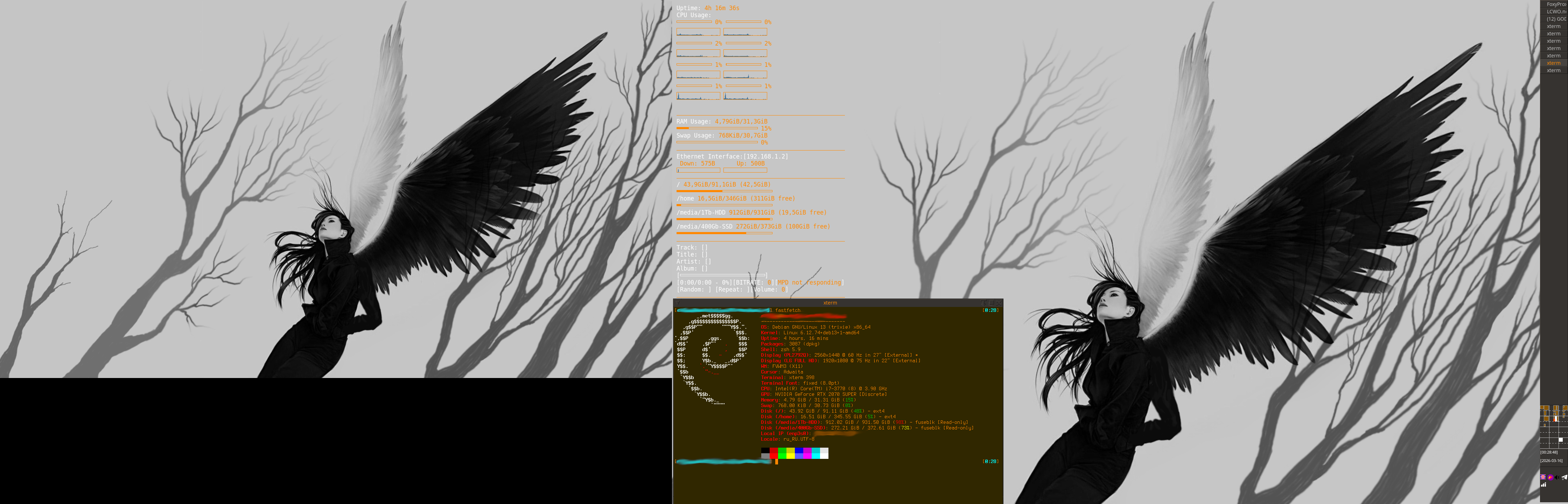 После того, как все пакеты были налиты, началась, собственно настройка. Самой сложной частью, оказалась настройка мультимониторности при использовании fvwm. К моему великому счастью, fvwm3 начал поддерживать randr, поэтому сама по себе, настройка двух мониторов у меня вообще времени не заняла - я запустил иксы и все само завелось. Больше проблем оказалось с настройкой горячих клавиш, чтобы ими можно было управлять окнами. Пришлось покопать документацию (и гугловую ИИшенку, которая просто невероятно галлюцинировала, выдумывая несуществующие опции настройки), сделать несколько костылей, но в итоге я смог заставить fvwm определять, на каком экране находится окно, и какую геометрию к нему применять. Еще не все закончено, но 95% функционала работает. Осталась лишь мелкая рихтовка выявленных в процессе работы нюансов. Забавно, что первую пару дней, мои пальцы продолжали пытаться нажимать комбинации клавиш, которые я использовал в Komorebi - все таки, за год использования, это все сильно въелось в мышечную память, но, сейчас, когда я пишу эту заметку, я уже не тянусь к кнопке Alt, чтобы переключить рабочий стол.